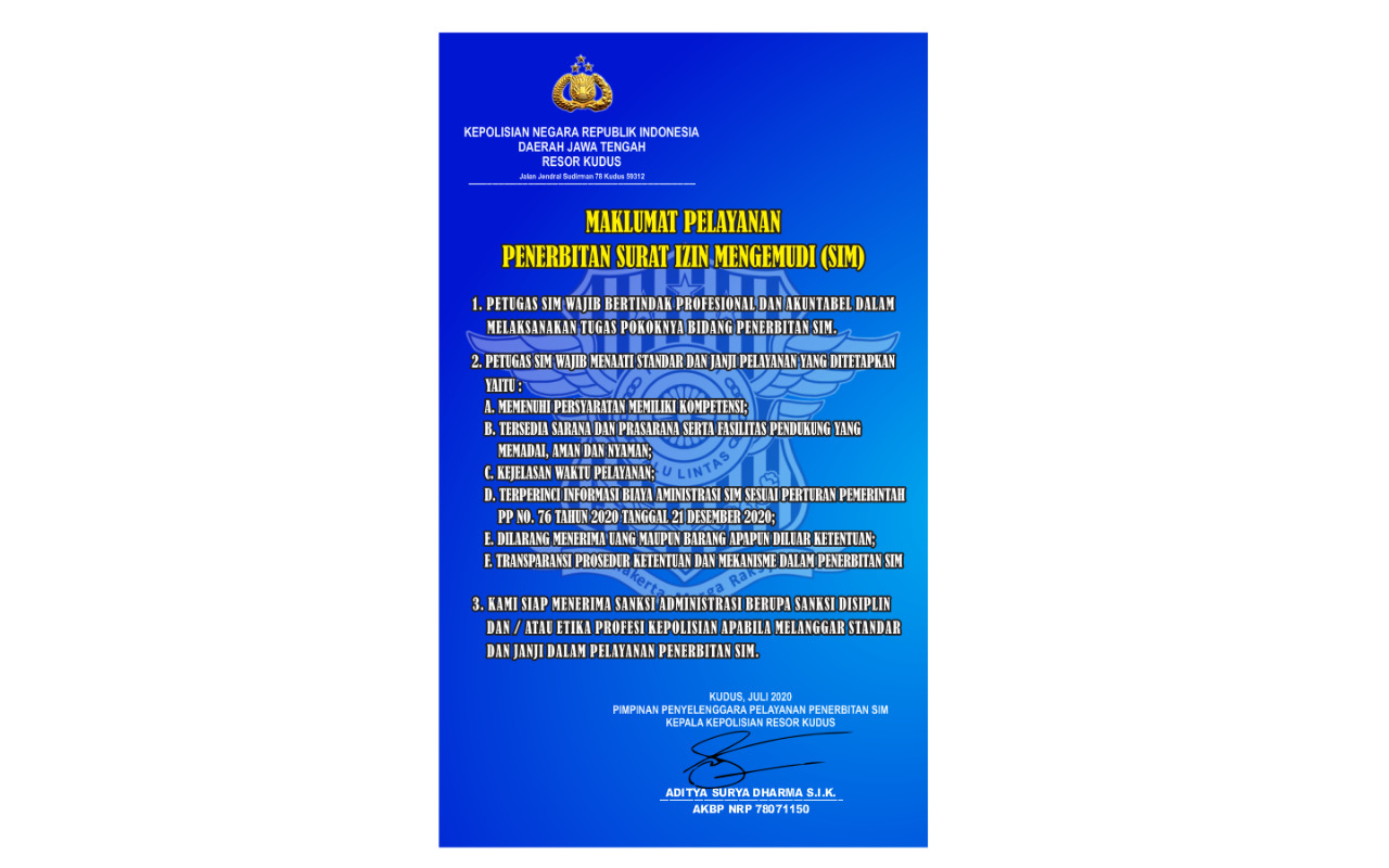 Dalam rangka memberikan pelayan kepada masyarakat khususnya di Kab Kudus maka satlantas Polres Kudus mengeluarkan Maklumat guna mendukung pelaksanakan tugas sehari-hari terkait perubahan PP No 76 Tahun 2020 tanggal 21 Desember 2020 tentang perubahan tarif PNBP Polri.