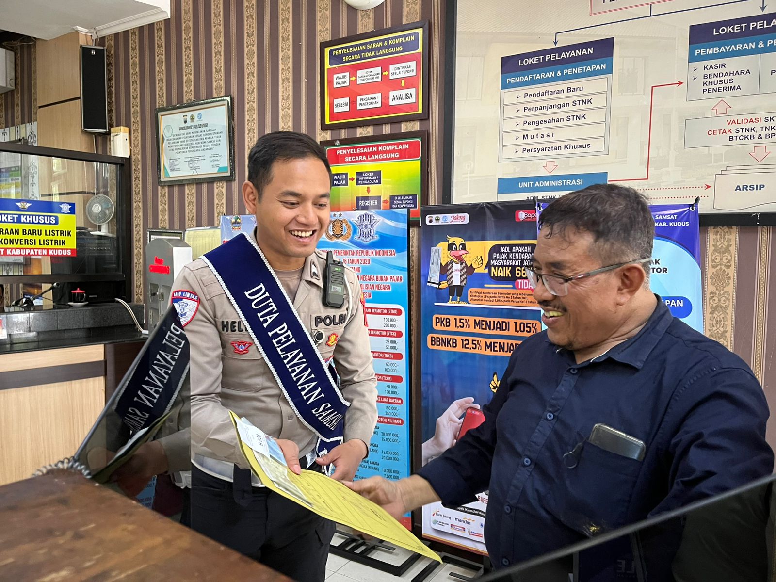 Duta Pelayanan Memberikan Edukasi Cek Fisik Nomor rangka dan Nomor Mesin Mobil dengan jelas dan humanis dan selalu mengingatkan agar sebelum meninggalkan Lapangan Pelayanan Cek fisik untuk mengecek lagi surat surat kendaraan dipastikan tidak ada yang tertinggal.
