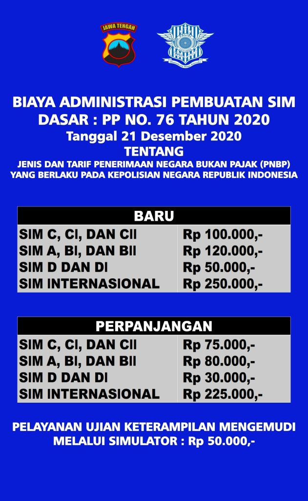 TARIF PNBP PENERBITAN SIM November 18, 2025 admin Uncategorized Berdasarkan PP No. 76 Tahun 2020 tentang Jenis dan Tarif Penerimaan Negara Bukan Pajak (PNBP) yang berlaku pada POLRI